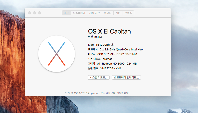 모델 식별자: MacPro3,1 (MacPro3,1은 Mac OS 10.5.1부터 Mac OS 10.11 엘캐피탄까지 설치가능합니다.)
