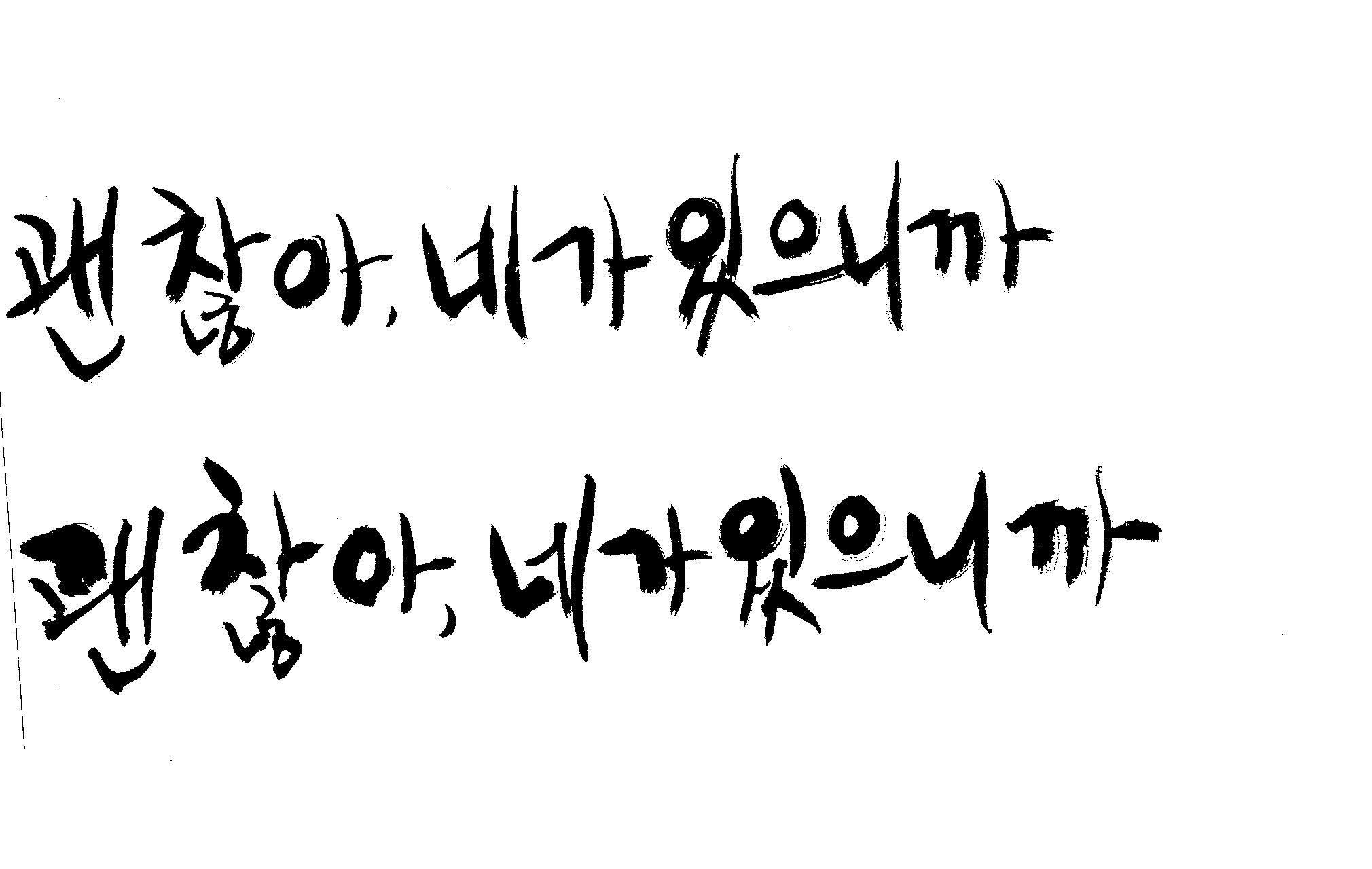 캘리 하나 부탁드릴께요. 김철호 일반 0 7652 2009.01.06 22:48 > > > > > 지금 작업중인 표지가있는데 > > > > 손글씨로 한번 작업해보려구요 > > > > 부탁드립니다. > > > > 괜 찮아, 네가 있으니까 > > >